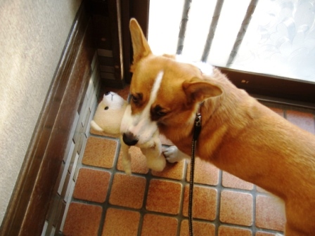 出かけついでに超お安い100円の縫いぐるみを見つけ、フルフルして音が鳴るのでメイに買って帰りました。